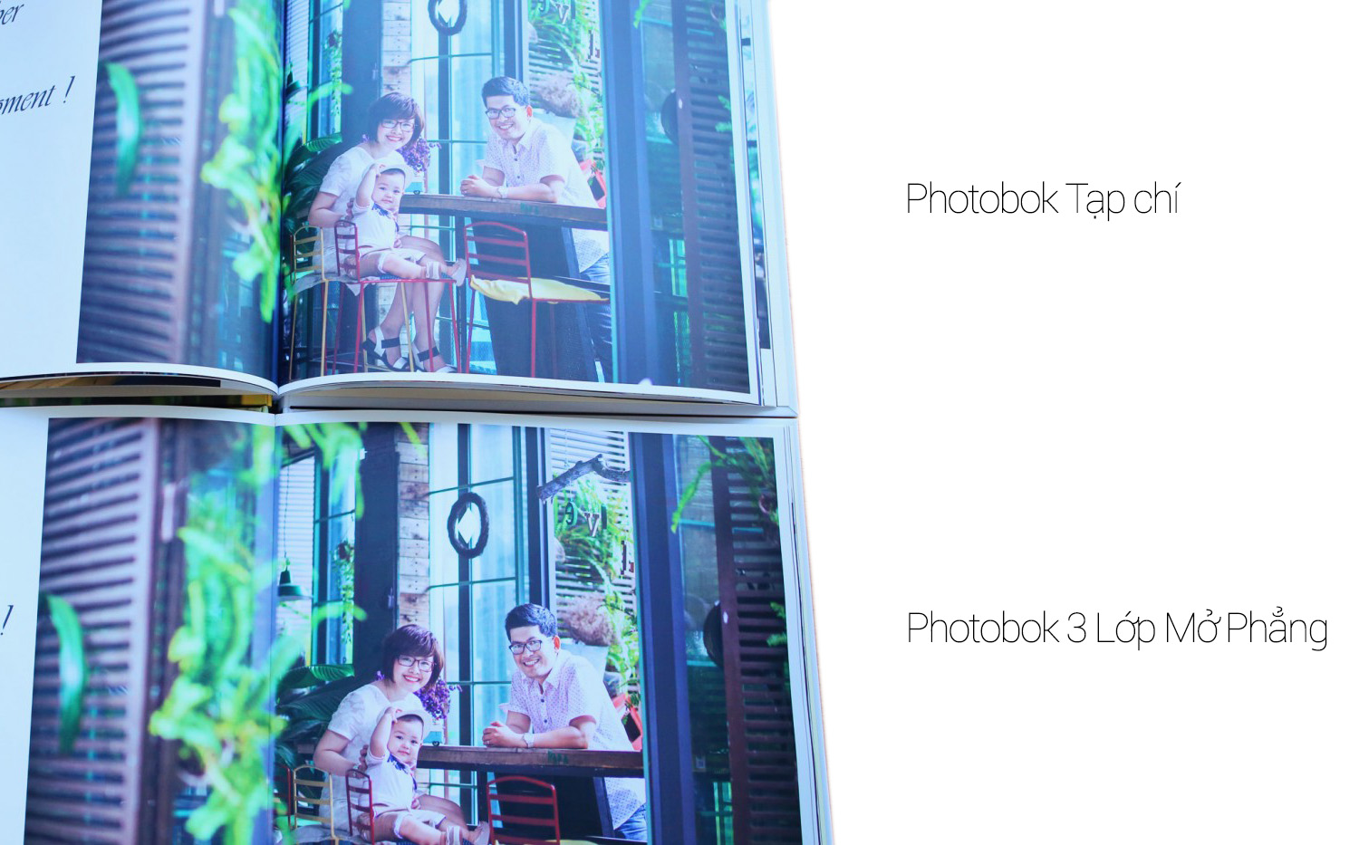 Đây là loại giống Photobook tạp chí nhưng được đóng cuốn theo phương pháp mở phẳng hình ảnh sẽ không bị che khuất bởi gáy sách. Ruột được phủ 2 lớp màng OPP, bảo vệ chắc chắn nhưng vẫn giữ được màu sắc đặc trưng tấm hình. Loại Photobook 3 lớp này được ưa chuộng vì độ bền chắc, không thấm nước, và dần được thay thế cho album laminate truyền thống.